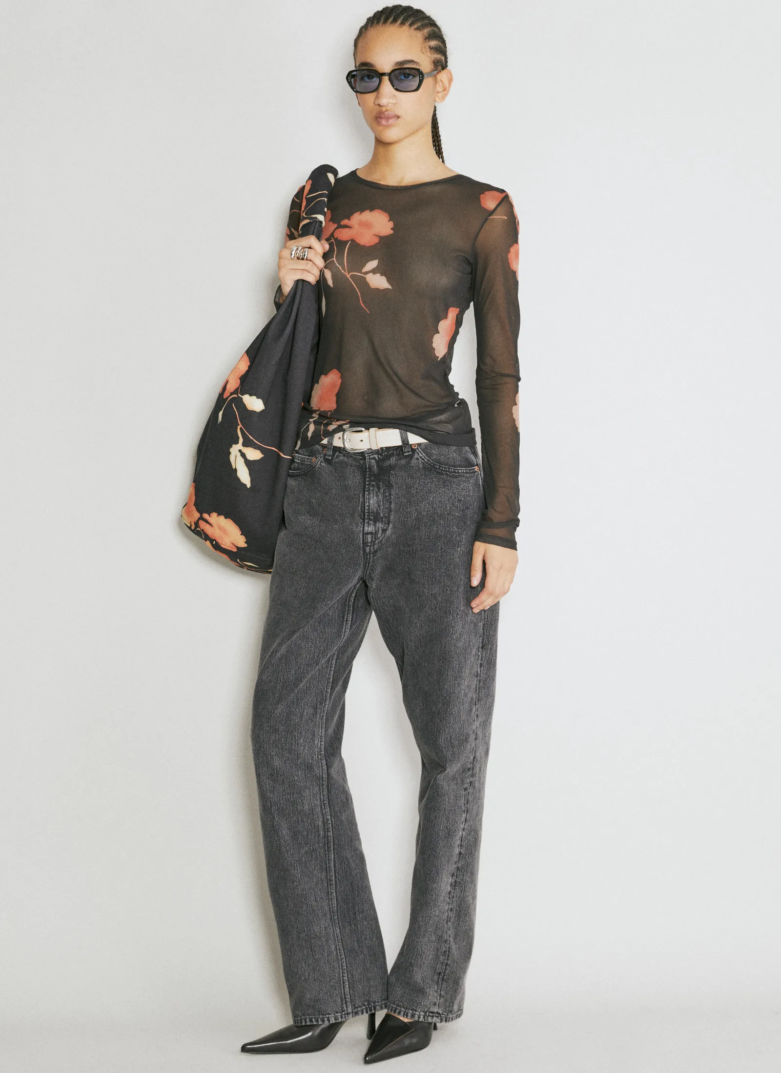 Drip Tote Bag In Denim With Flower Motif.