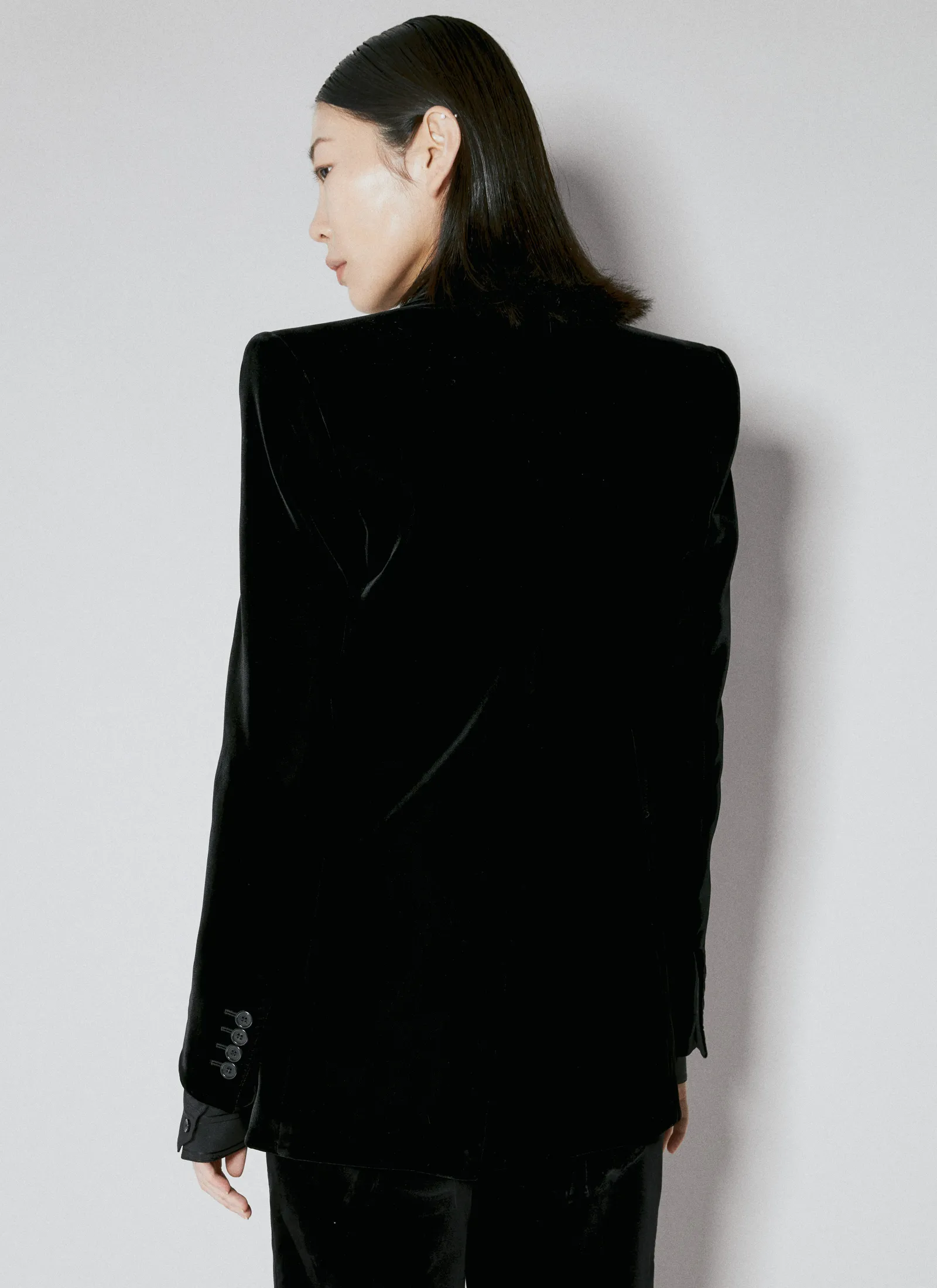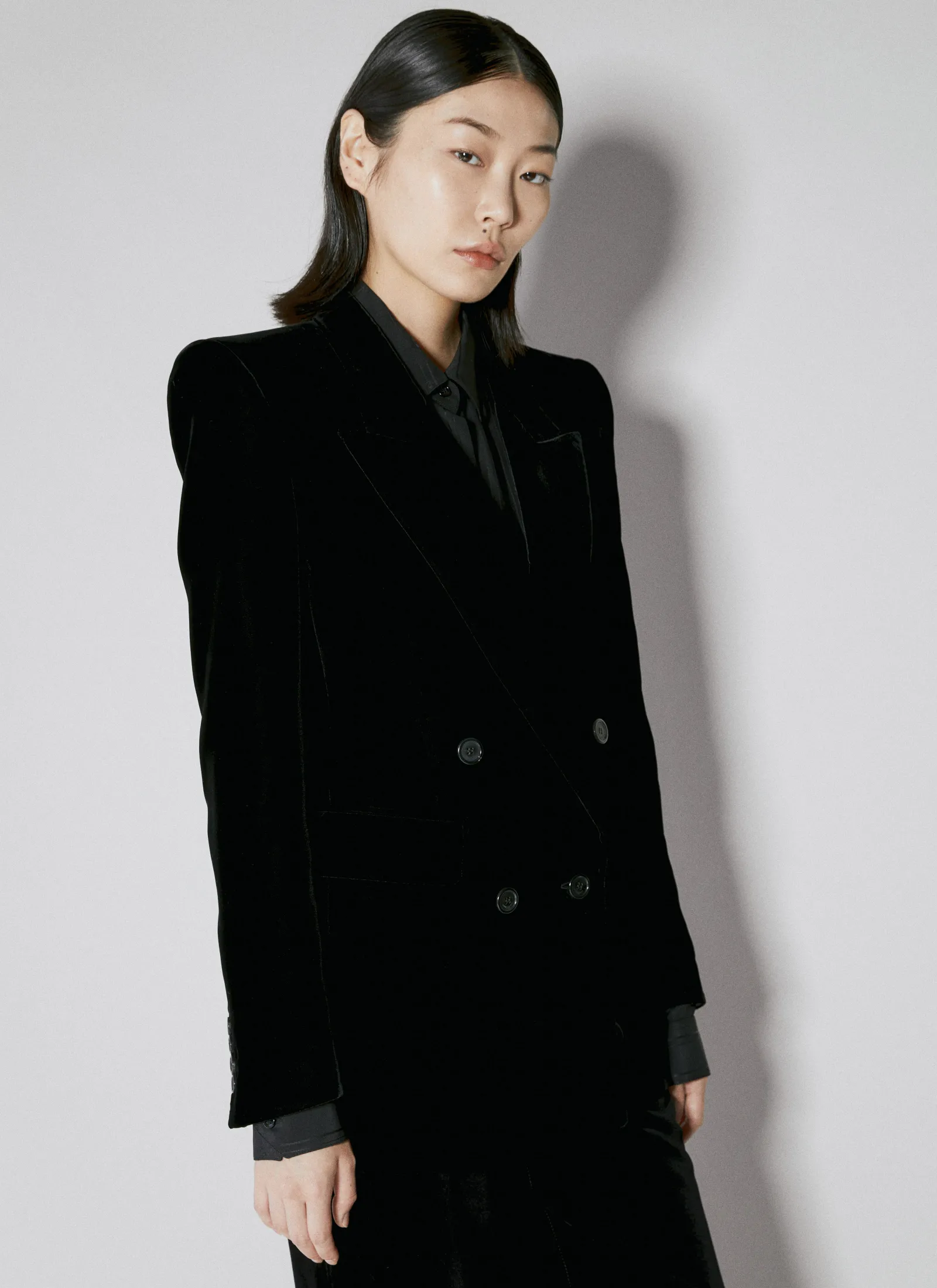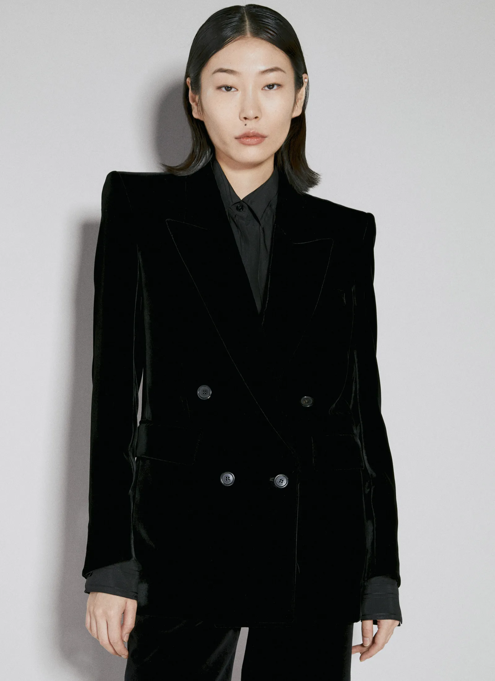 Velvet Double-Breasted Blazer With Shoulder Pads.